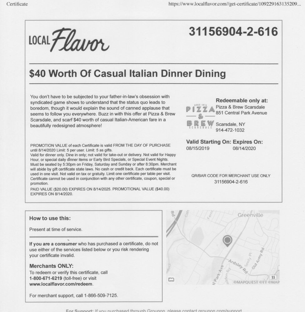 Pizza & Brew Scarsdale offers a wide range of Italian cuisine, including delicious salads, appetizers, entrees, and, of course, top-notch pizza. The Grandma pie is a must-try, with fresh basil, mozzarella, olive oil, and sweet tomato sauce. The attentive service and cozy atmosphere make you feel like part of the family. Don't miss out on the delectable desserts like carrot cake paired perfectly with cappuccino. The flaky pizza dough melts in your mouth, and signature cocktails like the winter white are not to be missed. While draft beers may not always be available, the extensive menu and excellent service make up for it. With plenty of parking and a welcoming vibe, Pizza & Brew Scarsdale is a must-visit for a satisfying meal with friends and family.